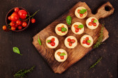 Mini tarty z cherry pomidory z mozzarellą na desce. Widok z góry. Miejsce.