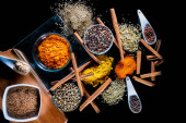 Wiersz o drewniane łyżki z przyprawami na tło, zmniejsza perspektywy, zbliżenie, selektywnej ostrości