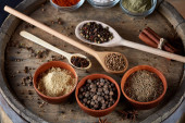 Zdjęcie "Wiersz o drewniane łyżki z przyprawami na tło, zmniejsza perspektywy, zbliżenie, selektywnej ostrości" może być wykorzystywane do celów osobistych i komercyjnych zgodnie z warunkami zakupionej licencji Royalty-free. Obraz jest dostępny do pobrania w jakości wysokiej rozdzielczości do 5760x3840.