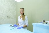 Kobieta kosmetyczka w rękawice i ze śmietaną i wklej do shugaring
