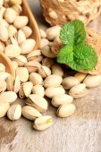 Pyszne, solone pistacje i świeżej mięty na podłoże drewniane.