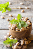 Pyszne, solone pistacje i świeżej mięty na podłoże drewniane.