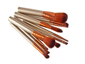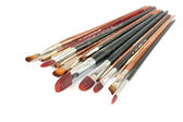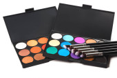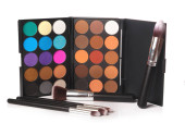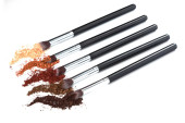 Zgnieciony szczotki cieni do powiek i makijaż na białym tle