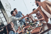 Zdjęcie "Grupa młodych ludzi w casual wear opiekania siebie i uśmiechając się podczas kolacji" może być wykorzystywane do celów osobistych i komercyjnych zgodnie z warunkami zakupionej licencji Royalty-free. Obraz jest dostępny do pobrania w jakości wysokiej rozdzielczości do 5760x3840.