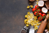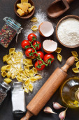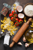 Tło włoski żywności. Składniki do gotowania makaronu: spaghetti, pomidor, bazylia i pieprz na ciemnym tle betonowych.