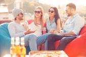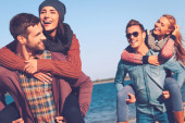 Szczęśliwa młoda kobieta trzyma szczenięta yorkshire terrier psów i uśmiechając się przyjęcie urodzinowe