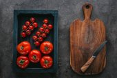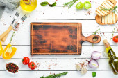 Składniki na kanapki z serem i pomidorami na ciemny drewniany stół