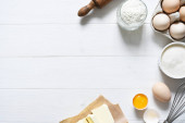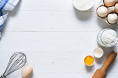 Zdjęcie "Składniki do gotowania makaronu włoskiego: mąka, jajko, olej i przyprawy. Włoskie jedzenie tło z miejsca na tekst." może być wykorzystywane do celów osobistych i komercyjnych zgodnie z warunkami zakupionej licencji Royalty-free. Obraz jest dostępny do pobrania w jakości wysokiej rozdzielczości do 5760x3840.