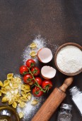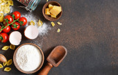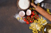 Składniki do gotowania makaronu włoskiego: mąka, jajko, olej i przyprawy. Włoskie jedzenie tło z miejsca na tekst.