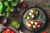 Proces tworzenia Kanapki z mozzarellą i pomidorami na drewnianym stole z pieczenia