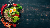 Zdjęcie "Zdrowe jedzenie. Płatki owsiane, sałata, rzodkiewka, jajko. Na tle drewnianych. Widok z góry. Bezpłatny egzemplarz przestrzeni." może być wykorzystywane do celów osobistych i komercyjnych zgodnie z warunkami zakupionej licencji Royalty-free. Obraz jest dostępny do pobrania w jakości wysokiej rozdzielczości do 5760x3840.