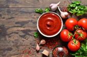 Zdjęcie "Adżyka jest gruziński krajowych sos z papryki, czosnku i przypraw na czarnym tle. Sos. Jedzenie." może być wykorzystywane do celów osobistych i komercyjnych zgodnie z warunkami zakupionej licencji Royalty-free. Obraz jest dostępny do pobrania w jakości wysokiej rozdzielczości do 5760x3840.