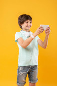 Portret szczęśliwy uczennica little słuchanie muzyki przez słuchawki i zabawy na żółtym tle