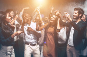 szczęśliwych ludzi obchodzi urodziny, uśmiechnięta kobieta z zadaszonym oczy, czekając na ciasto