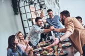 dwóch młodych mężczyzn, uścisk dłoni i uśmiech podczas kolacji strony wśród znajomych