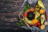 Sałatką ze świeżych warzyw. Kukurydza, rzodkiewka, cebula, ogórek, Jaja przepiórcze. Na tle drewnianych. Widok z góry. Bezpłatny egzemplarz przestrzeni.