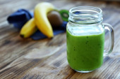 Mango, Banana, lniane posiłku z wody kokosowej, jagody goji i Matcha Smoothie