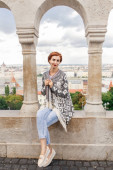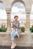 Młoda ruda dziewczyna pozowanie na arcade z tarasu widokowego w Budapest, Węgry