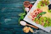 Szaszłyki z kurczaka surowego z pomidorów oraz warzyw. Kebab. Na tle drewnianych. Widok z góry. Miejsce.