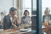 pięknych młodych ludzi w casual wear mówi i uśmiecha się podczas kolacji pomieszczeniu