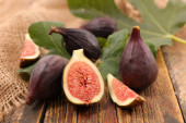 Wirydarz-do góry fotografia świeżych fig i liści na drewnianym stole