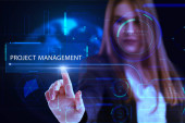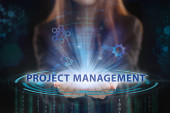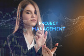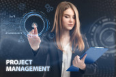 Koncepcja biznesu, technologii, Internetu i sieci. Młody przedsiębiorca działa na wirtualnym ekranie przyszłości i widzi napis: Zarządzanie projektami