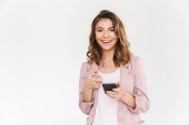 Zdjęcie "Portret pewnie młoda kobieta pokazuje pusty ekran telefonu komórkowego na białym tle nad białym tle" może być wykorzystywane do celów osobistych i komercyjnych zgodnie z warunkami zakupionej licencji Royalty-free. Obraz jest dostępny do pobrania w jakości wysokiej rozdzielczości do 5760x3840.