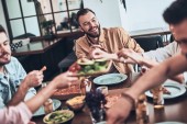 Grupa młodych ludzi, wybierając plasterki pizzy, a posiadanie obiad w kawiarni