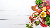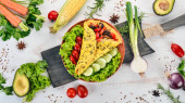 Żywności. Dania z awokado, Skrzydełka kurczaka, omlet oraz sprzęt do grillowania. Na tle drewnianych. Widok z góry. Miejsce.