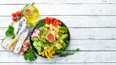Zdjęcie "Żywności. Dania z awokado, Skrzydełka kurczaka, omlet oraz sprzęt do grillowania. Na tle drewnianych. Widok z góry. Miejsce." może być wykorzystywane do celów osobistych i komercyjnych zgodnie z warunkami zakupionej licencji Royalty-free. Obraz jest dostępny do pobrania w jakości wysokiej rozdzielczości do 5760x3840.