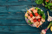 Zdjęcie "Pieczoną cielęciną shish kebab na talerzu ze świeżych warzyw. Na tle drewnianych. Widok z góry. Miejsce." może być wykorzystywane do celów osobistych i komercyjnych zgodnie z warunkami zakupionej licencji Royalty-free. Obraz jest dostępny do pobrania w jakości wysokiej rozdzielczości do 5760x3840.