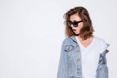 Portret dość młoda kobieta w okulary, stojąc i patrząc na kamery na białym tle nad białym tle pozowanie