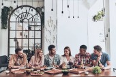 stylowe ludzi mówi i uśmiecha się jedząc obiad w restauracji