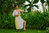 Szczęśliwa młoda kobieta z kosz pełen owoców egzotycznych w tropikalnym ogrodzie