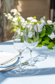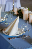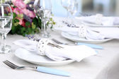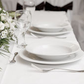 Klasyczny stół ustawienie. Sprzęt AGD, Okulary, biały obrus i płyta
