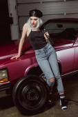 Widok pełnej długości stylowy Blondynka w okularach słonecznych i beret gospodarstwa staromodny walizka bear retro samochodów