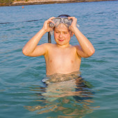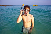 młody chłopak w piękne czyste morze zaczyna, nurkowanie z rurką
