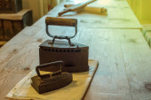 Zbliżenie na leżącego na drewnianym stole nożyczki dla szwaczki
