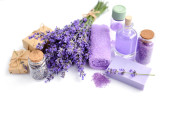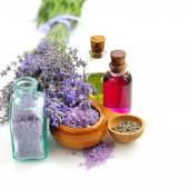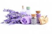 Spa kompozycja z kwiatów lawendy, sól i butelka olejku na białym tle