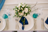 Zdjęcie "Tabela z klasycznym. Z kompozycji w wysoki wazon z hortensji i lilie, złoty Świecznik z niebieski świece. Dekoracje i florystyka" może być wykorzystywane do celów osobistych i komercyjnych zgodnie z warunkami zakupionej licencji Royalty-free. Obraz jest dostępny do pobrania w jakości wysokiej rozdzielczości do 5760x3840.
