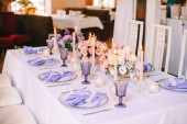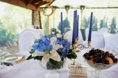 Tabela z klasycznym. Z kompozycji w wysoki wazon z hortensji i lilie, złoty Świecznik z niebieski świece. Dekoracje i florystyka