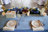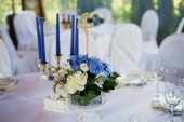 Zdjęcie "Tabela z klasycznym. Z kompozycji w wysoki wazon z hortensji i lilie, złoty Świecznik z niebieski świece. Dekoracje i florystyka" może być wykorzystywane do celów osobistych i komercyjnych zgodnie z warunkami zakupionej licencji Royalty-free. Obraz jest dostępny do pobrania w jakości wysokiej rozdzielczości do 5760x3840.