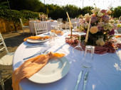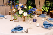 Zdjęcie "Tabela z klasycznym. Z kompozycji w wysoki wazon z hortensji i lilie, złoty Świecznik z niebieski świece. Dekoracje i florystyka. Usłane różami" może być wykorzystywane do celów osobistych i komercyjnych zgodnie z warunkami zakupionej licencji Royalty-free. Obraz jest dostępny do pobrania w jakości wysokiej rozdzielczości do 5760x3840.