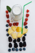 Świeżo pokrojone owoce w słoiku: truskawka, wiśnia banany i jagody na szarym tle. Przydatne przekąska.