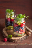 Świeżo pokrojone owoce w słoiku: truskawka, wiśnia banany i jagody na szarym tle. Przydatne przekąska.