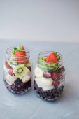 Świeżo pokrojone owoce w słoiku: truskawka, wiśnia banany i jagody na szarym tle. Przydatne przekąska.