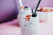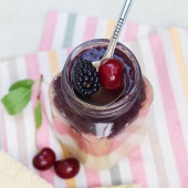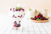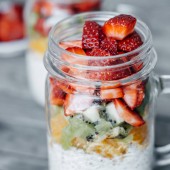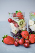Ręka kobiety ze świeżych owoców w plasterkach w słoiku: truskawka, wiśnia banany i jagody na szarym tle. Przydatne przekąska.