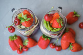 Zdjęcie "Ręka kobiety ze świeżych owoców w plasterkach w słoiku: truskawka, wiśnia banany i jagody na szarym tle. Przydatne przekąska." może być wykorzystywane do celów osobistych i komercyjnych zgodnie z warunkami zakupionej licencji Royalty-free. Obraz jest dostępny do pobrania w jakości wysokiej rozdzielczości do 5760x3840.