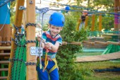 chłopiec, zabawy w parku rozrywki. Toddler wspinaczki w strukturze zabaw liny. Toddler wspinaczki w strukturze zabaw liny. Bezpieczny sport ekstremalny wspinaczka kask i karabińczykiem