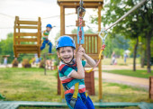 szczęśliwy chłopiec zabawy i gry w parku rozrywki, przytrzymanie liny i wspinaczka schody drewniane.